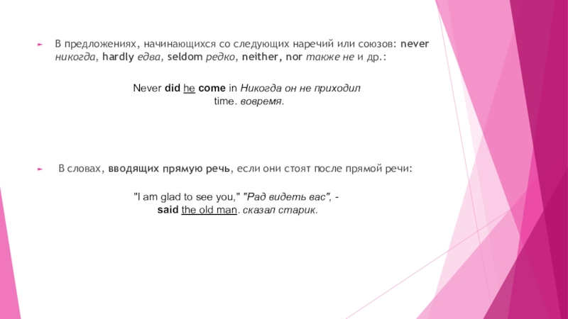 Слайд 14В предложениях, начинающихся со следующих наречий или союзов: never никогда, hardly