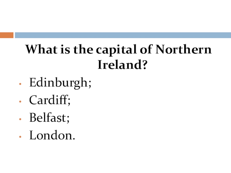What is the capital of Northern Ireland? Edinburgh; Cardiff; Belfast; London.