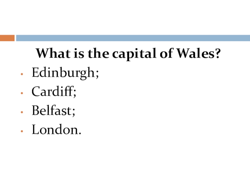 What is the capital of Wales? Edinburgh; Cardiff; Belfast; London.