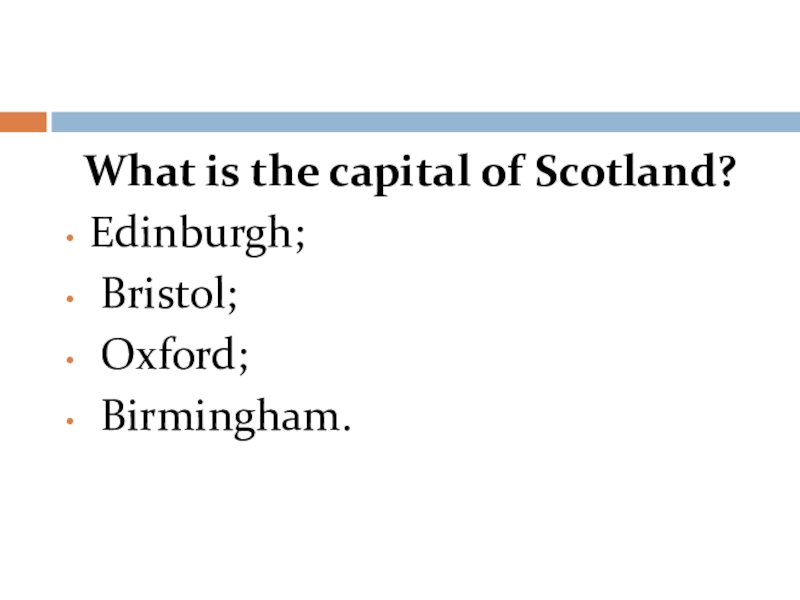 What is the capital of Scotland? Edinburgh; Bristol; Oxford; Birmingham.