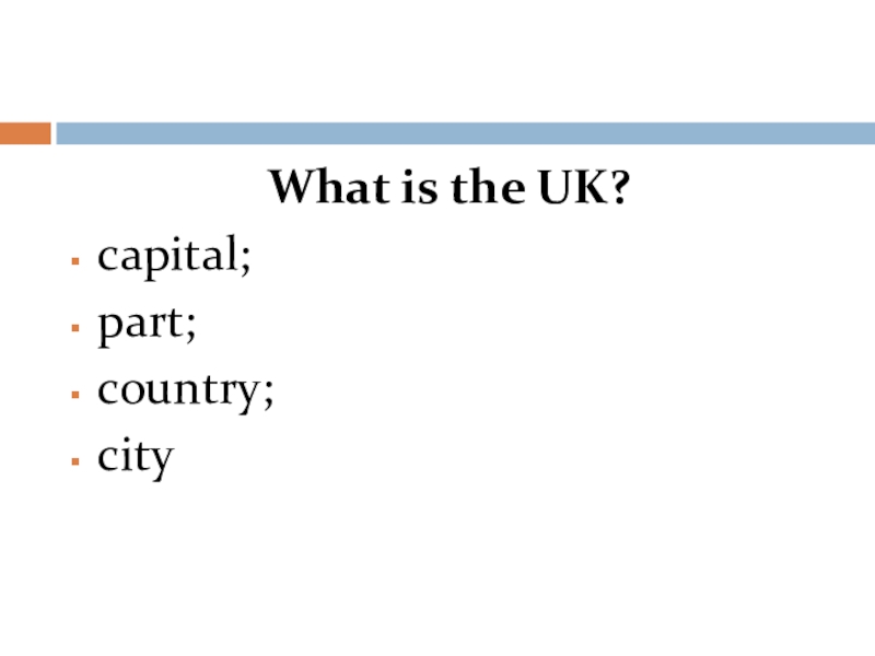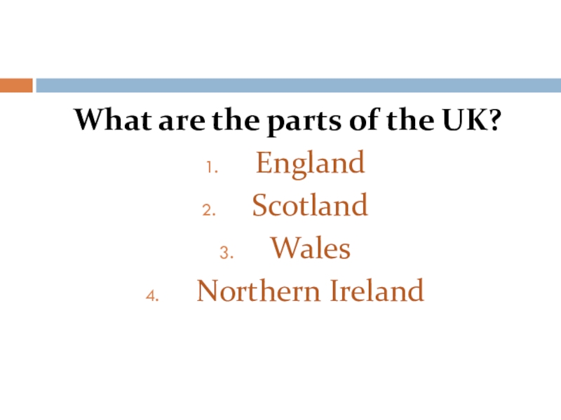 What are the parts of the UK?EnglandScotlandWalesNorthern Ireland