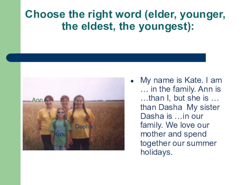 My name is Kate. I am … in the family. Ann is …than I, but she is … than Dasha My sister Dasha is …in our family. We love our mother and spend together our summer holidays.