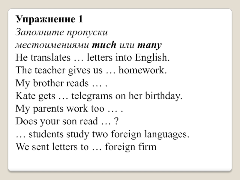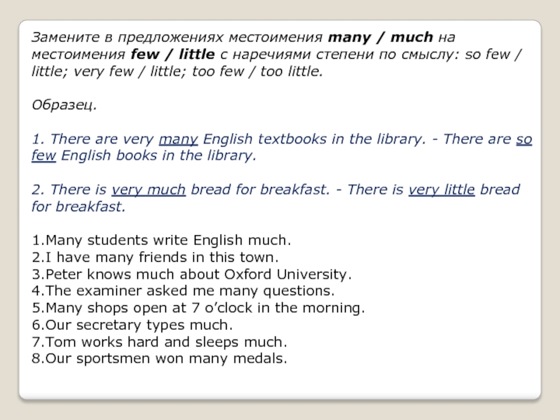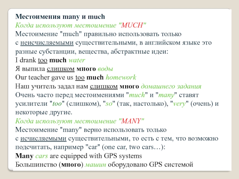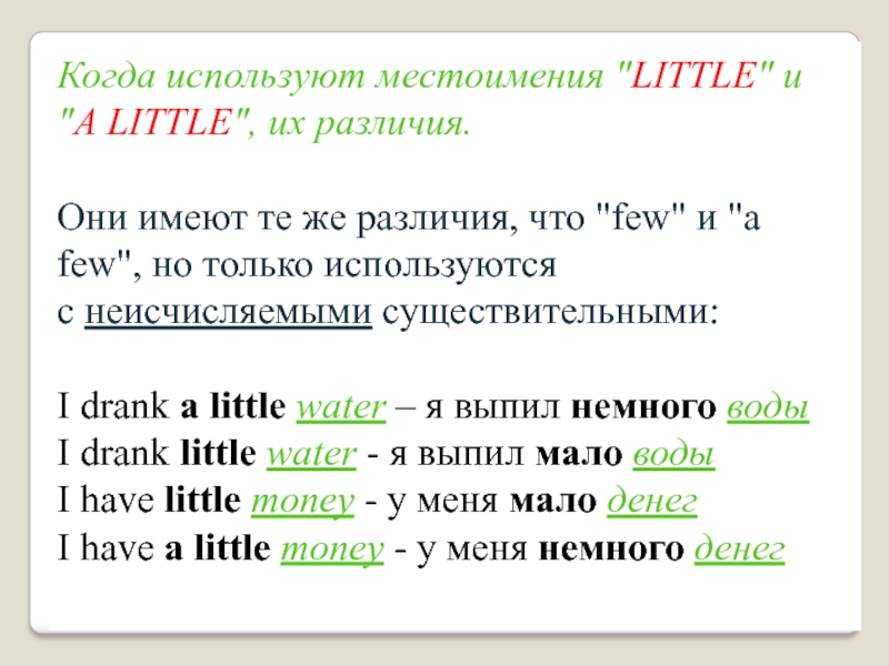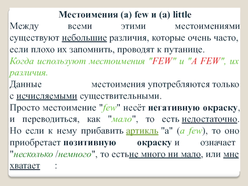 Основными и часто употребляемыми данной группы местоимения являются "much", "many", "a lot of", "a few", "a little", "few" и "little".