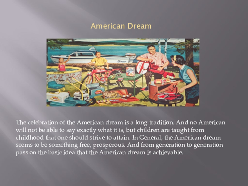 The celebration of the American dream is a long tradition. And no American will not be able to say exactly what it is, but children are taught from childhood that one should strive to attain. In General, the American dream seems to be something free, prosperous. And from generation to generation pass on the basic idea that the American dream is achievable.