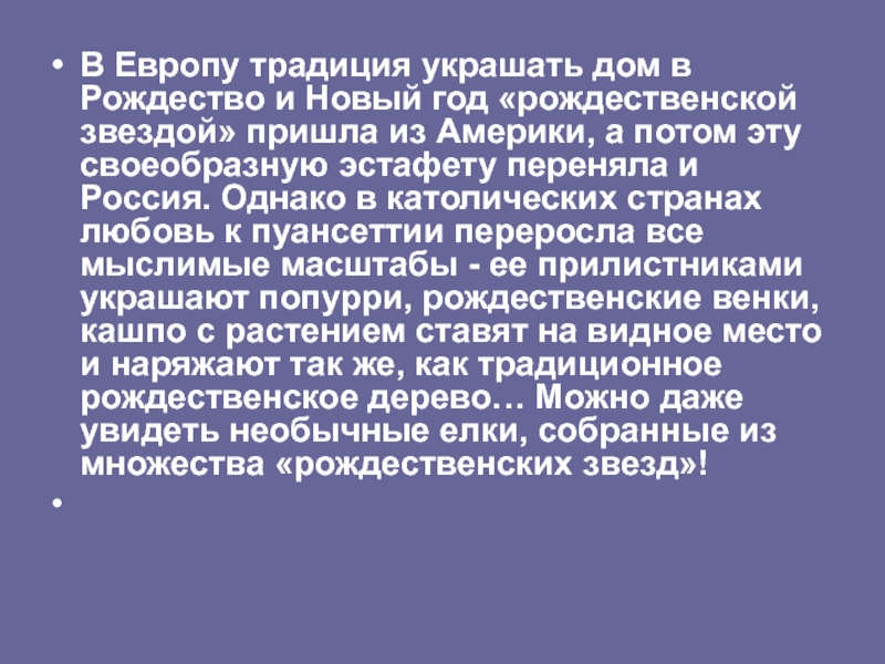звездой» пришла из Америки, а потом эту своеобразную эстафету переняла и Россия. Однако в католических странах любовь к пуансеттии переросла все мыслимые масштабы - ее прилистниками украшают попурри, рождественские венки, кашпо с растением ставят на видное место и наряжают так же, как традиционное рождественское дерево… Можно даже увидеть необычные елки, собранные из множества «рождественских звезд»!