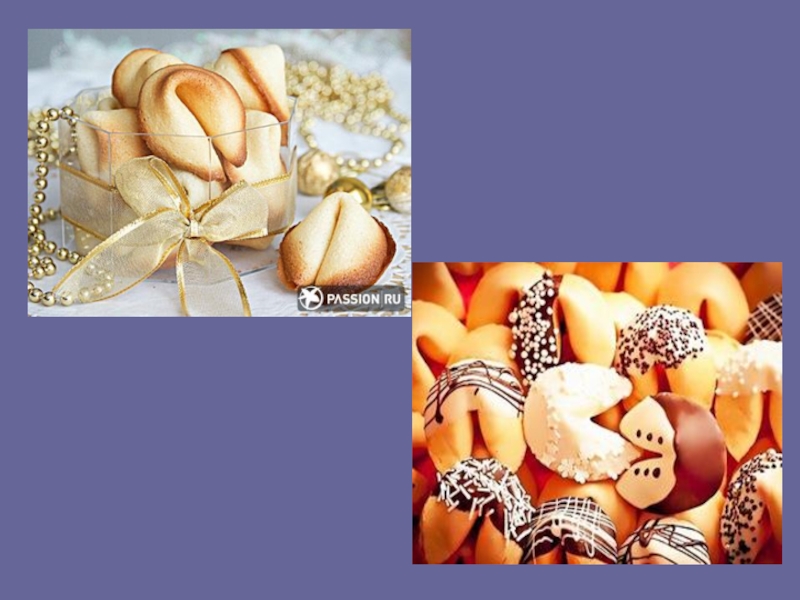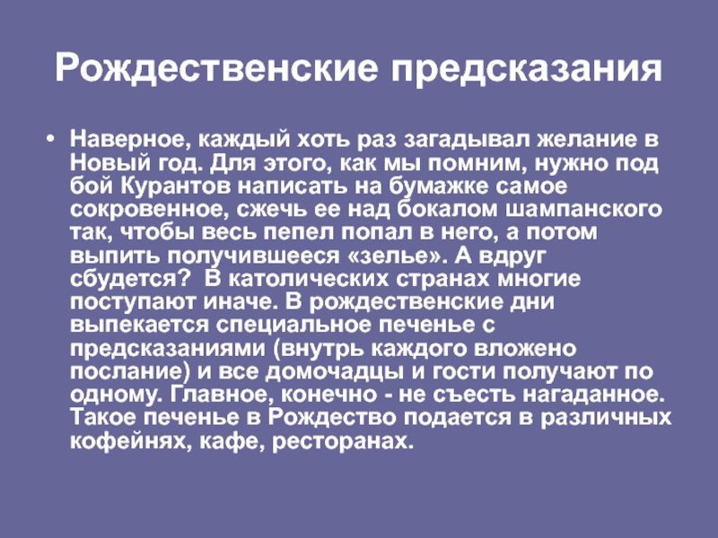 этого, как мы помним, нужно под бой Курантов написать на бумажке самое сокровенное, сжечь ее над бокалом шампанского так, чтобы весь пепел попал в него, а потом выпить получившееся «зелье». А вдруг сбудется? В католических странах многие поступают иначе. В рождественские дни выпекается специальное печенье с предсказаниями (внутрь каждого вложено послание) и все домочадцы и гости получают по одному. Главное, конечно - не съесть нагаданное. Такое печенье в Рождество подается в различных кофейнях, кафе, ресторанах.