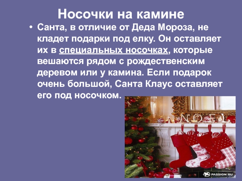 под елку. Он оставляет их в специальных носочках, которые вешаются рядом с рождественским деревом или у камина. Если подарок очень большой, Санта Клаус оставляет его под носочком.