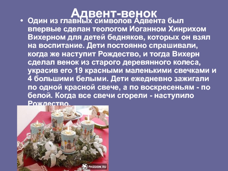 Вихерном для детей бедняков, которых он взял на воспитание. Дети постоянно спрашивали, когда же наступит Рождество, и тогда Вихерн сделал венок из старого деревянного колеса, украсив его 19 красными маленькими свечками и 4 большими белыми. Дети ежедневно зажигали по одной красной свече, а по воскресеньям - по белой. Когда все свечи сгорели - наступило Рождество.