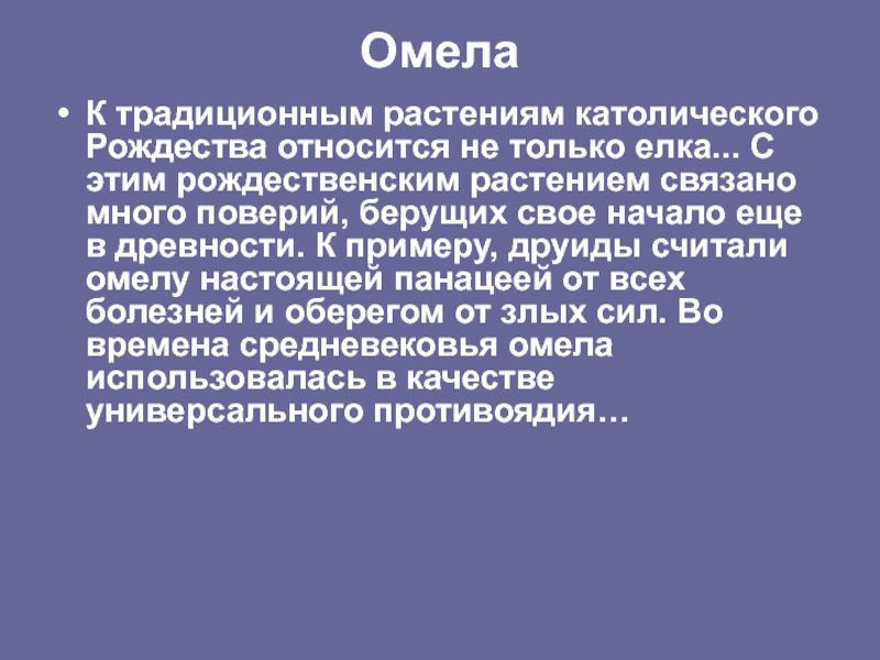 рождественским растением связано много поверий, берущих свое начало еще в древности. К примеру, друиды считали омелу настоящей панацеей от всех болезней и оберегом от злых сил. Во времена средневековья омела использовалась в качестве универсального противоядия…