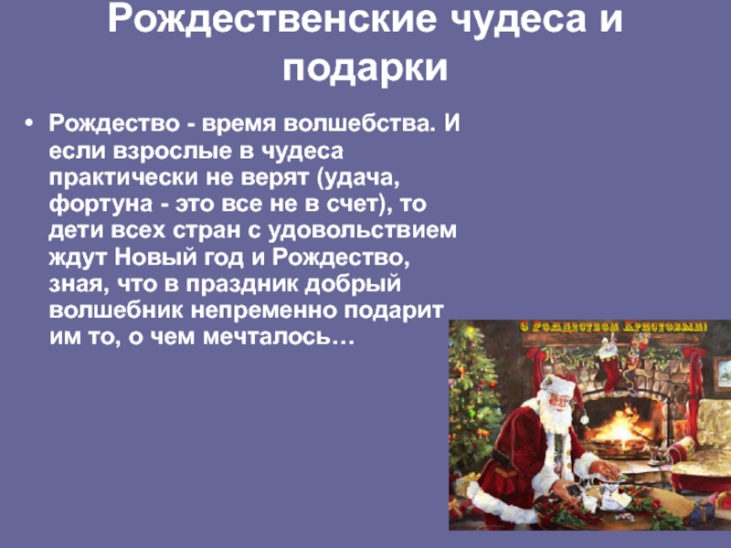 чудеса практически не верят (удача, фортуна - это все не в счет), то дети всех стран с удовольствием ждут Новый год и Рождество, зная, что в праздник добрый волшебник непременно подарит им то, о чем мечталось…