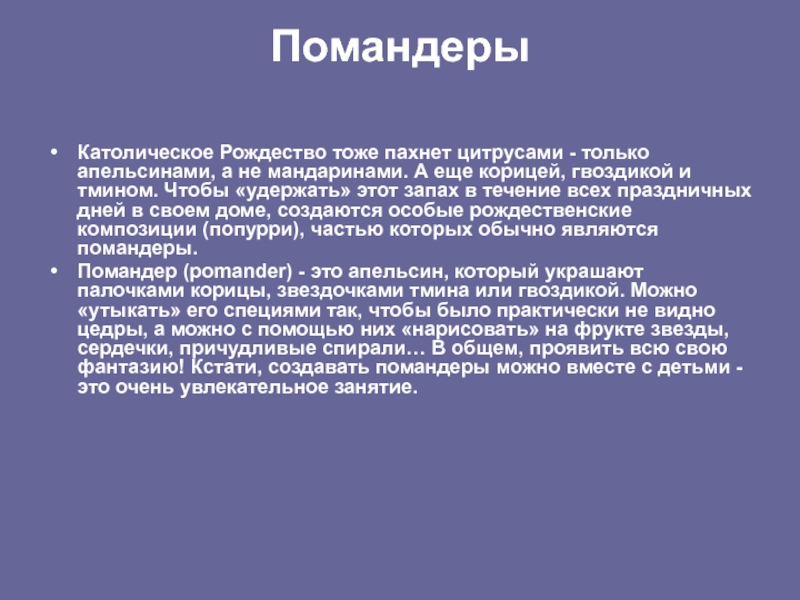А еще корицей, гвоздикой и тмином. Чтобы «удержать» этот запах в течение всех праздничных дней в своем доме, создаются особые рождественские композиции (попурри), частью которых обычно являются помандеры.
