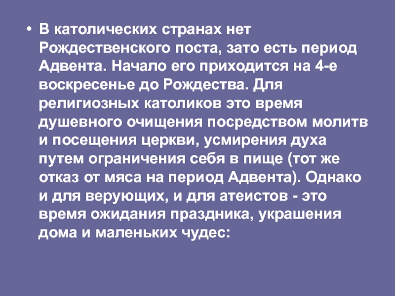 Слайд 3В католических странах нет Рождественского поста, зато есть период Адвента. Начало