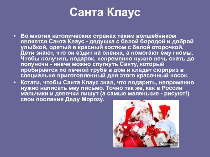 Кстати, чтобы Санта Клаус знал, что подарить, непременно нужно написать ему письмо. Точно так же, как в России мальчики и девочки пишут (а самые маленькие - рисуют!) свои послания Деду Морозу.