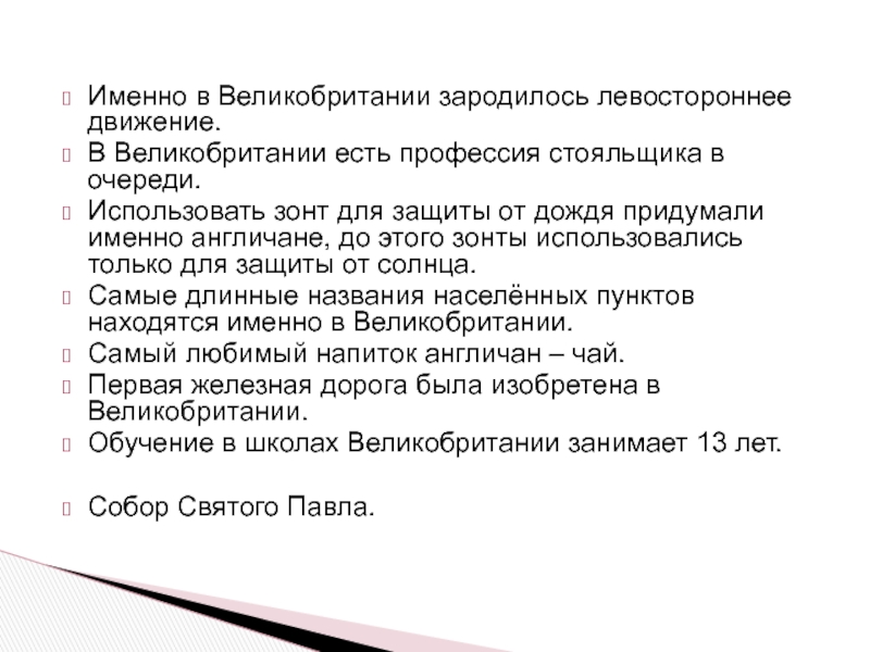 Именно в Великобритании зародилось левостороннее движение.В Великобритании есть профессия стояльщика в очереди.Использовать зонт для защиты от дождя придумали именно англичане, до этого зонты использовались только для защиты от солнца.Самые длинные названия населённых пунктов находятся именно в