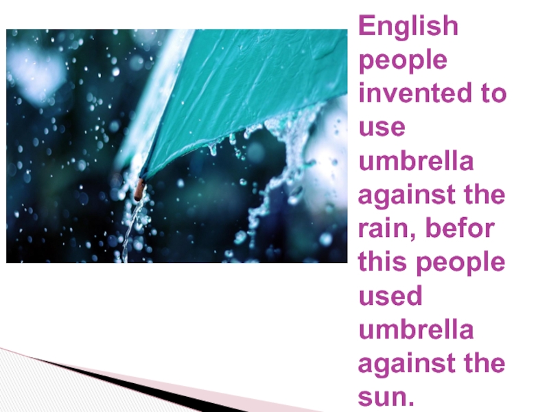 Слайд 5English people invented to use umbrella against the rain, befor this