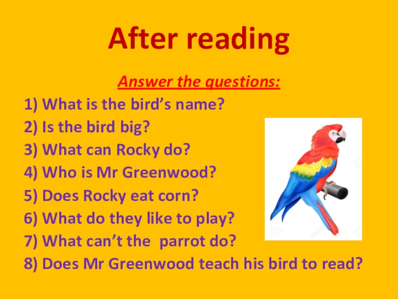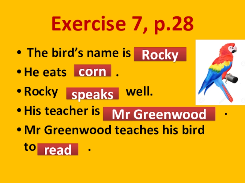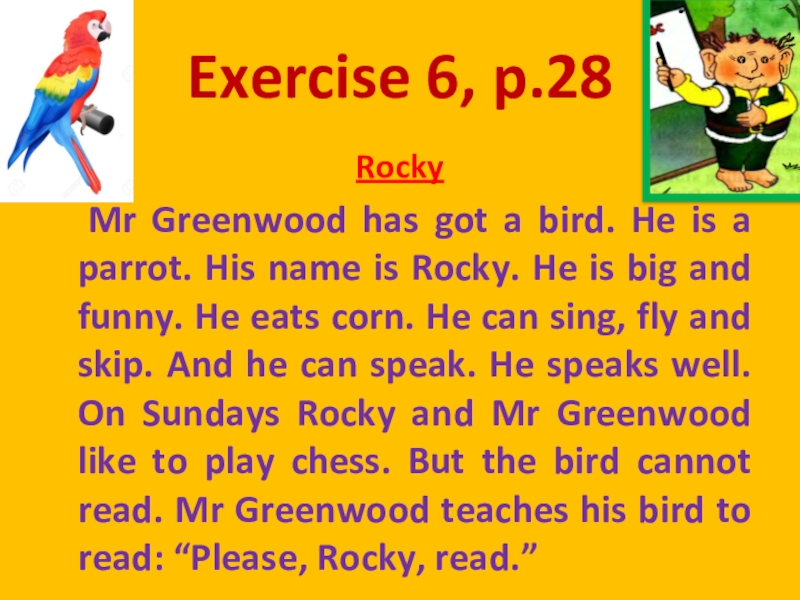 parrot. His name is Rocky. He is big and funny. He eats corn. He can sing, fly and skip. And he can speak. He speaks well. On Sundays Rocky and Mr Greenwood like to play chess. But the bird cannot read. Mr Greenwood teaches his bird to read: “Please, Rocky, read.”