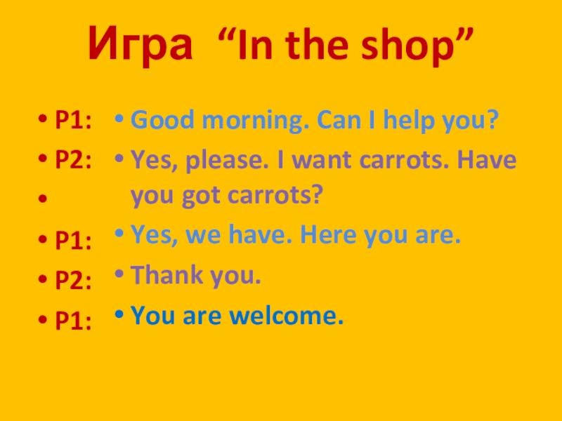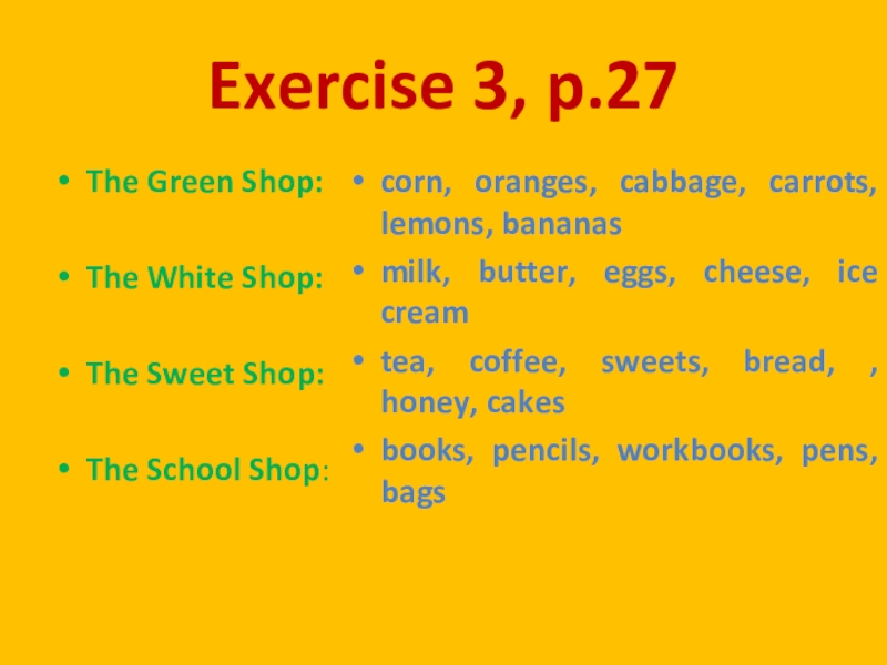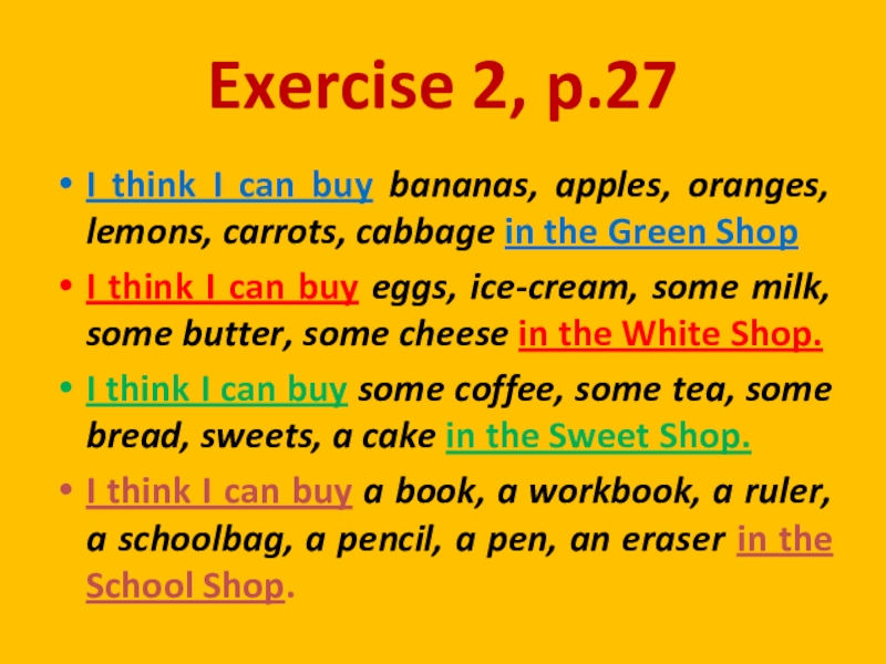 They would like to buy carrots, and apples in the Green Shop. They would like to buy a blue pen and a green pencil in the School Shop.