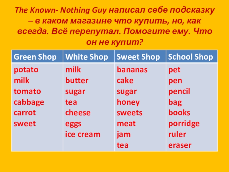 Слайд 13The Known- Nothing Guy написал себе подсказку – в каком магазине