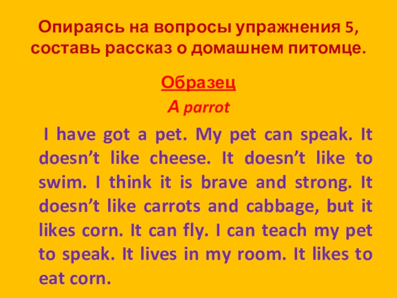 have got a pet. My pet can speak. It doesn’t like cheese. It doesn’t like to swim. I think it is brave and strong. It doesn’t like carrots and cabbage, but it likes corn. It can fly. I can teach my pet to speak. It lives in my room. It likes to eat corn.