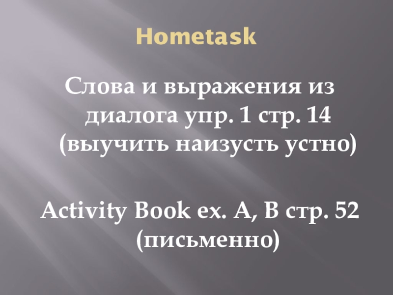 HometaskСлова и выражения из диалога упр. 1 стр. 14 (выучить наизусть устно)Activity Book ex. A, B стр.