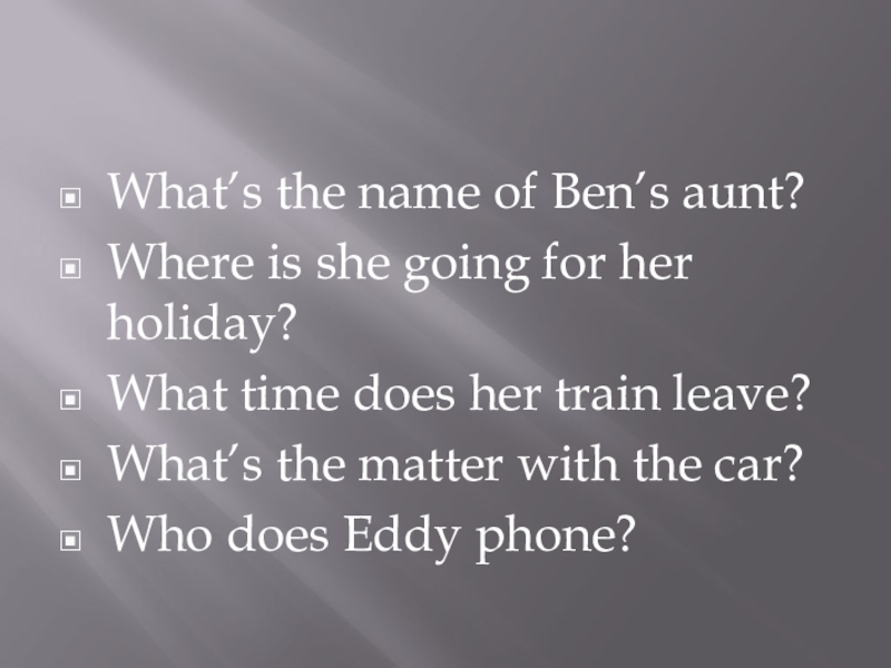 What’s the name of Ben’s aunt?Where is she going for her holiday?What time does her train leave?What’s