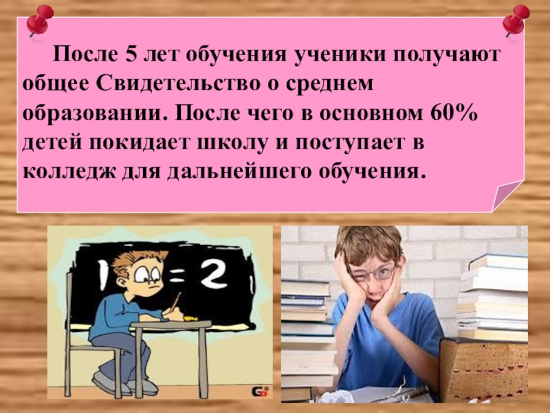 После 5 лет обучения ученики получают общее Свидетельство о среднем образовании. После чего в основном 60% детей покидает школу и поступает в колледж для дальнейшего обучения.