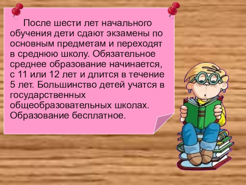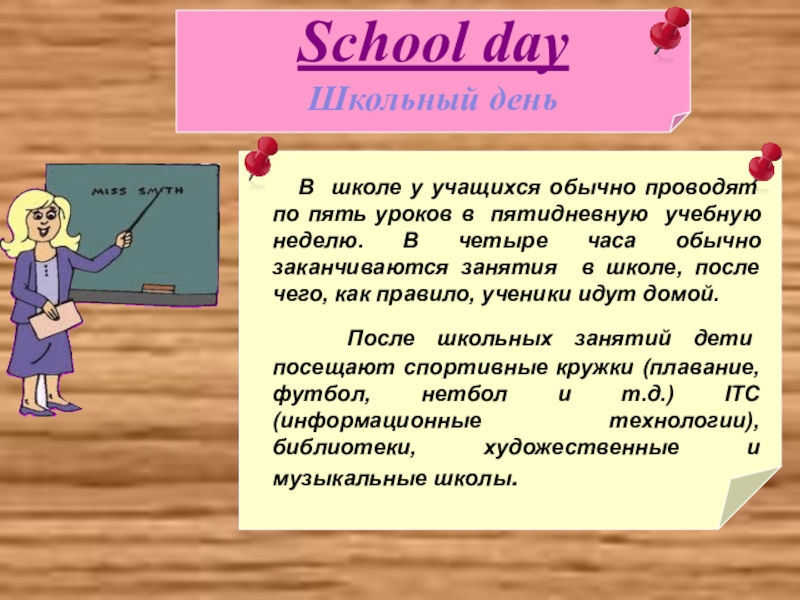по пять уроков в пятидневную учебную неделю. В четыре часа обычно заканчиваются занятия в школе, после чего, как правило, ученики идут домой.