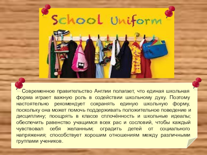 важную роль в содействии школьному духу. Поэтому настоятельно рекомендует сохранять единую школьную форму, поскольку она может помочь поддерживать положительное поведение и дисциплину; поощрять в классе сплочённость и школьные идеалы; обеспечить равенство учащимся всех рас и сословий, чтобы каждый чувствовал себя желанным; оградить детей от социального напряжения; способствует хорошим отношениям между различными группами учеников.