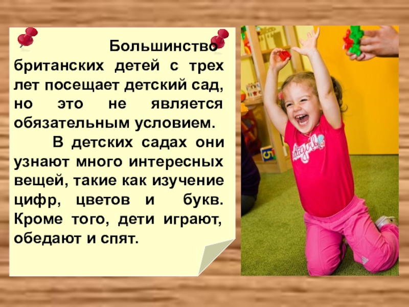 В детских садах они узнают много интересных вещей, такие как изучение цифр, цветов и букв. Кроме того, дети играют, обедают и спят.