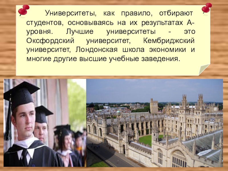 A- уровня. Лучшие университеты - это Оксфордский университет, Кембриджский университет, Лондонская школа экономики и многие другие высшие учебные заведения.