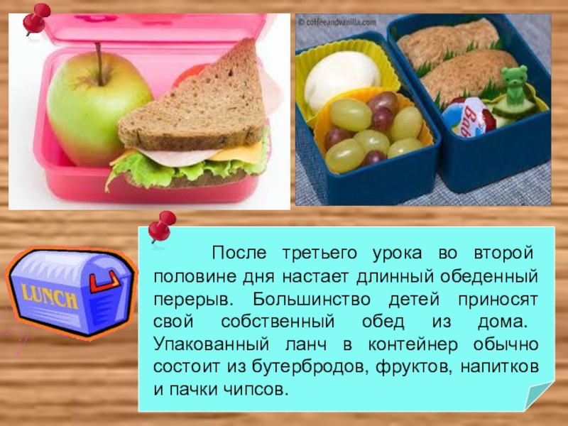 обеденный перерыв. Большинство детей приносят свой собственный обед из дома. Упакованный ланч в контейнер обычно состоит из бутербродов, фруктов, напитков и пачки чипсов.