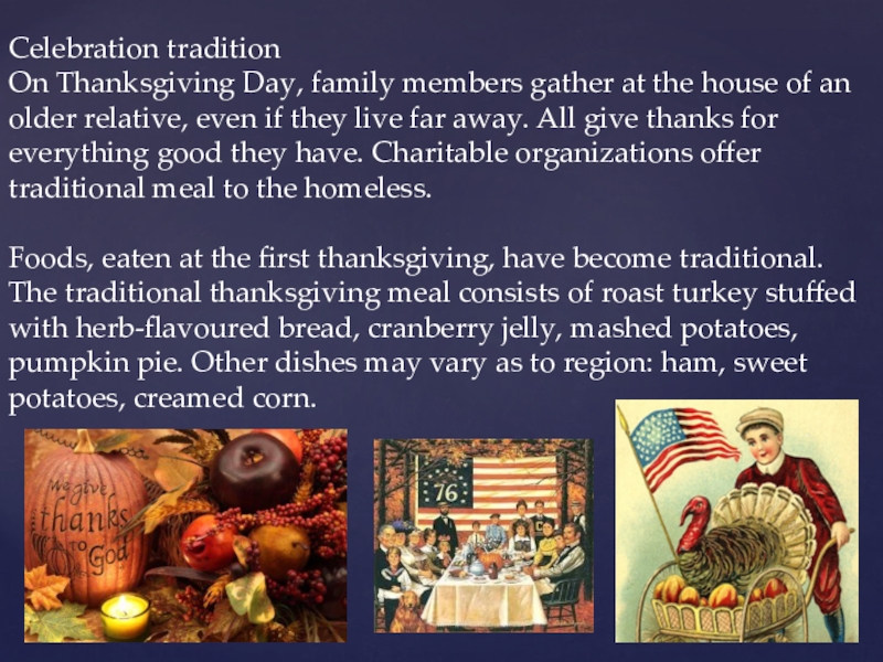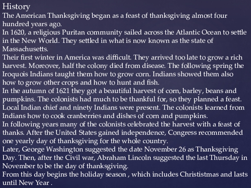 In the autumn of 1621 they got a beautiful harvest of corn, barley, beans and pumpkins. The colonists had much to be thankful for, so they planned a feast. Local Indian chief and ninety Indians were present. The colonists learned from Indians how to cook cranberries and dishes of corn and pumpkins.