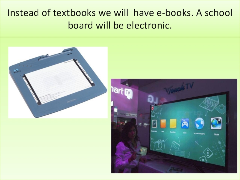 Слайд 3Instead of textbooks we will have e-books. A school board will