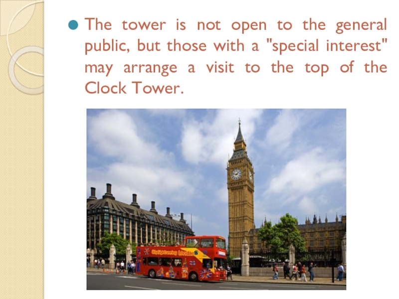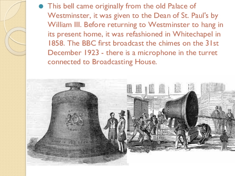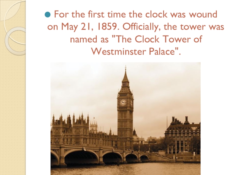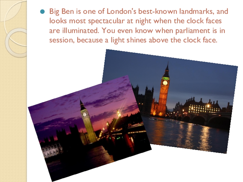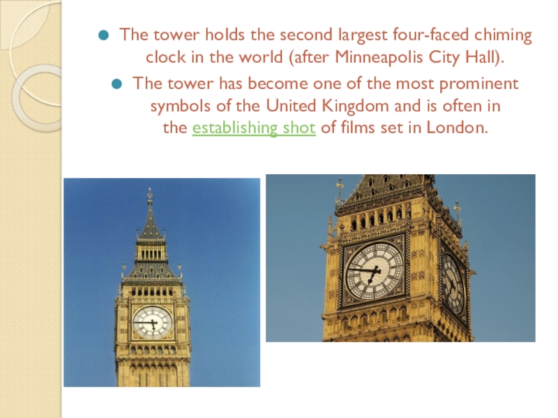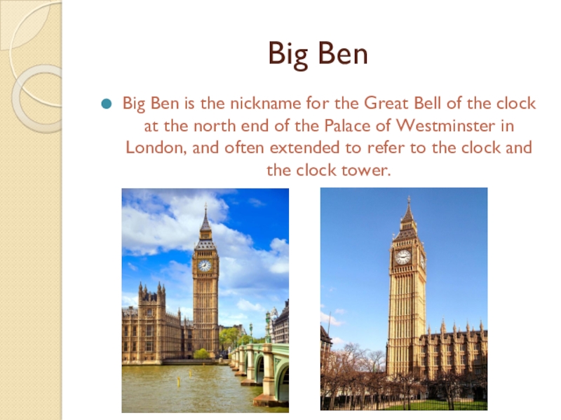 the clock at the north end of the Palace of Westminster in London, and often extended to refer to the clock and the clock tower.