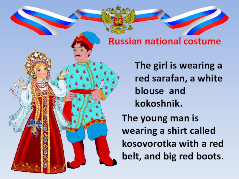 The young man is wearing a shirt called kosovorotka with a red belt, and big red boots.