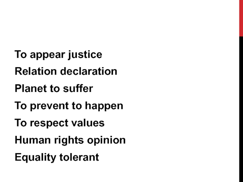 To appear justiceRelation declarationPlanet to sufferTo prevent to happenTo respect valuesHuman rights opinionEquality tolerant