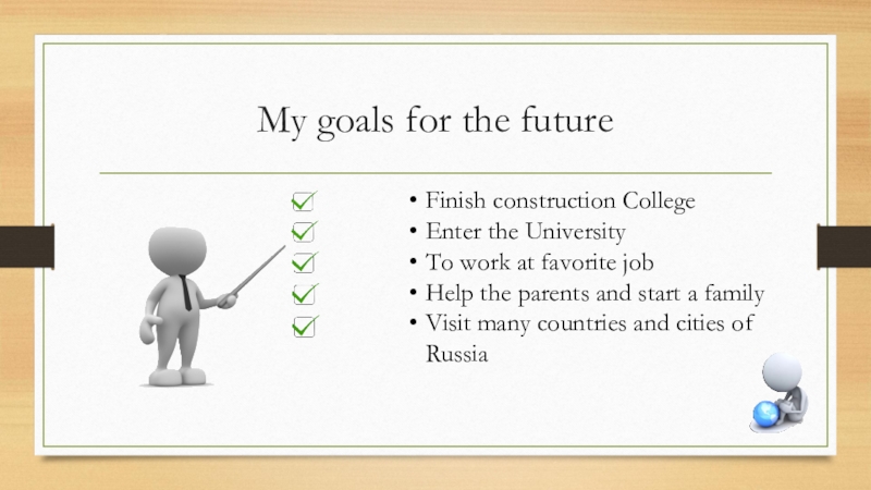 Мy goals for the futureFinish construction CollegeEnter the UniversityTo work at favorite jobHelp the parents and start