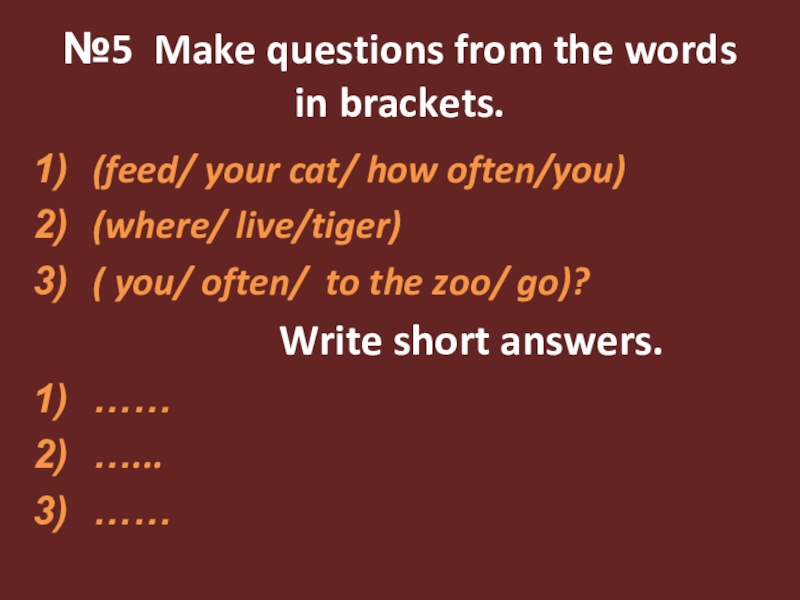 №5 Make questions from the words in brackets.(feed/ your cat/ how often/you)(where/ live/tiger) ( you/ often/ to