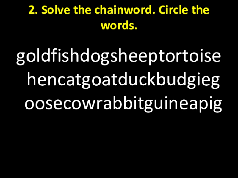 2. Solve the chainword. Circle the words. goldfishdogsheeptortoisehencatgoatduckbudgiegoosecowrabbitguineapig