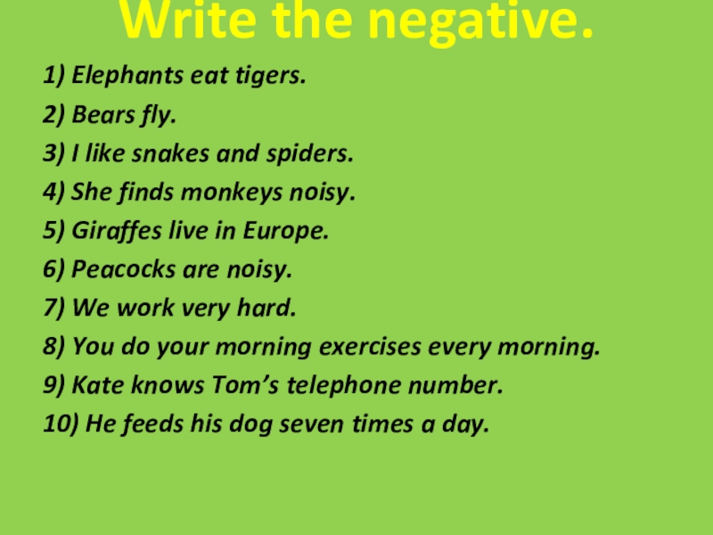 Write the negative. 1) Elephants eat tigers.2) Bears fly.3) I like snakes and spiders.4) She finds monkeys