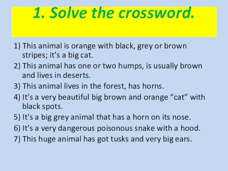1. Solve the crossword. 1) This animal is orange with black, grey or brown stripes; it’s a big cat.2) This animal has one or two humps, is usually brown and lives in deserts. 3) This animal