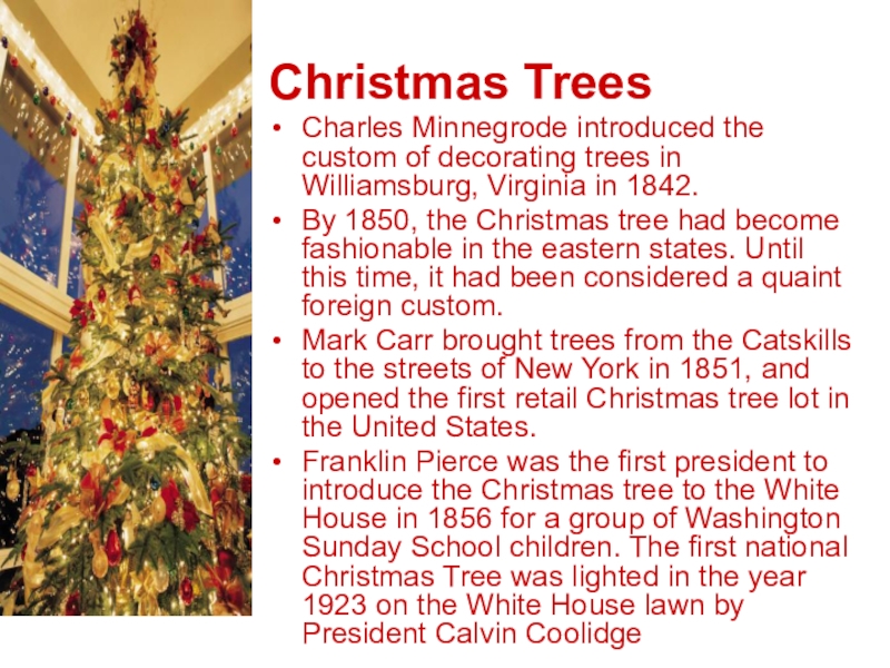 Franklin Pierce was the first president to introduce the Christmas tree to the White House in 1856 for a group of Washington Sunday School children. The first national Christmas Tree was lighted in the year 1923 on the White House lawn by President Calvin Coolidge