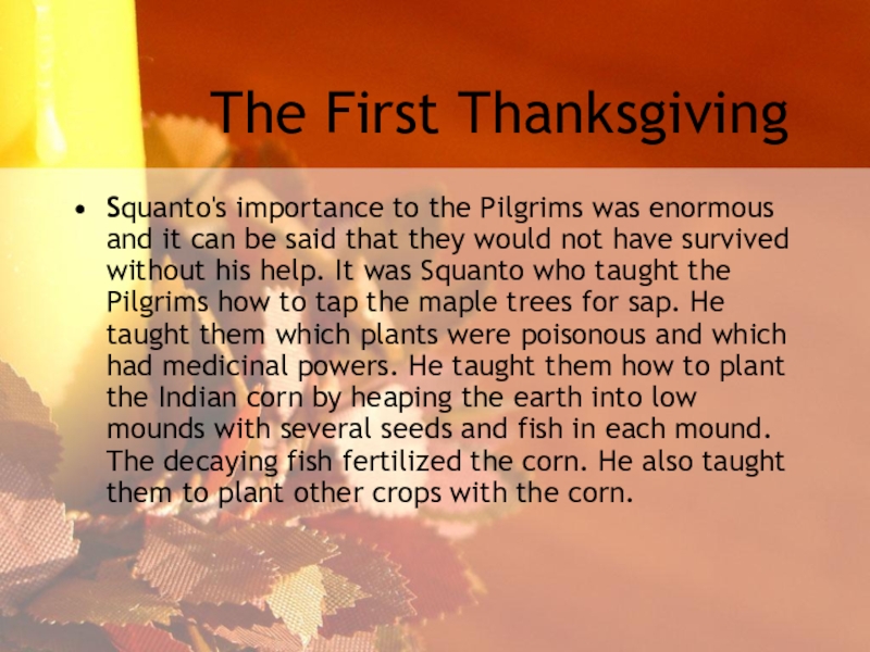 can be said that they would not have survived without his help. It was Squanto who taught the Pilgrims how to tap the maple trees for sap. He taught them which plants were poisonous and which had medicinal powers. He taught them how to plant the Indian corn by heaping the earth into low mounds with several seeds and fish in each mound. The decaying fish fertilized the corn. He also taught them to plant other crops with the corn.