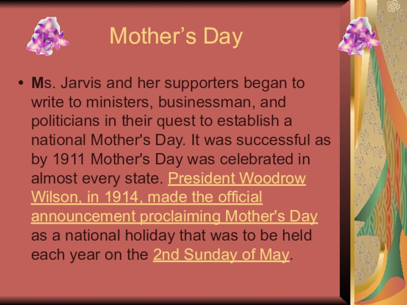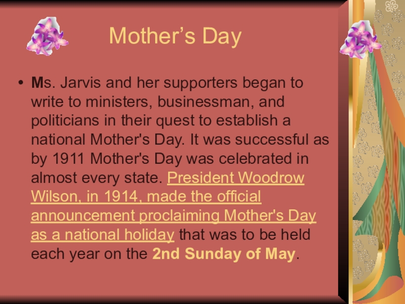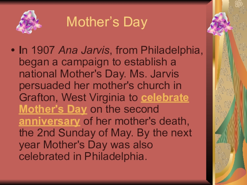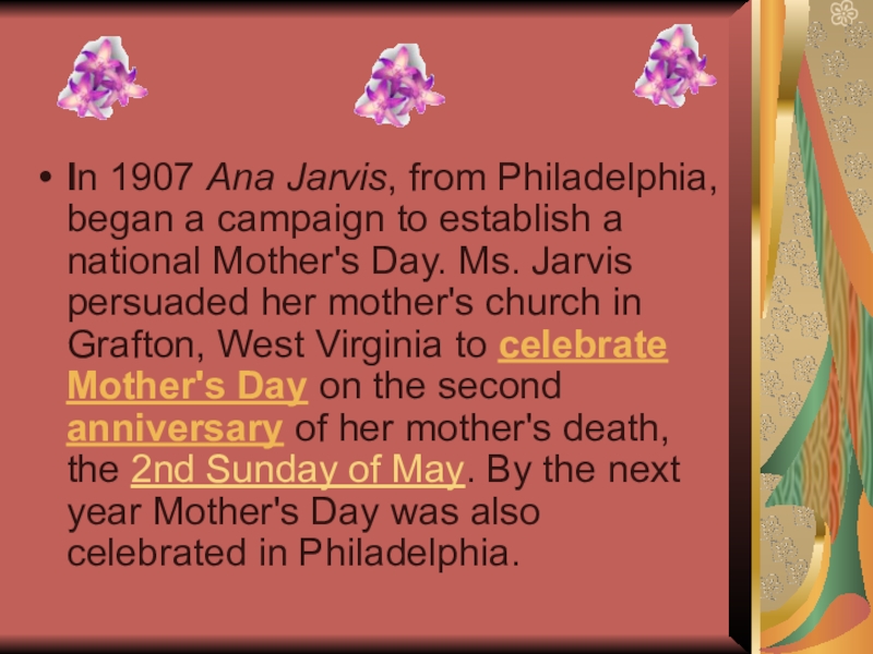 Слайд 21In 1907 Ana Jarvis, from Philadelphia, began a campaign to establish