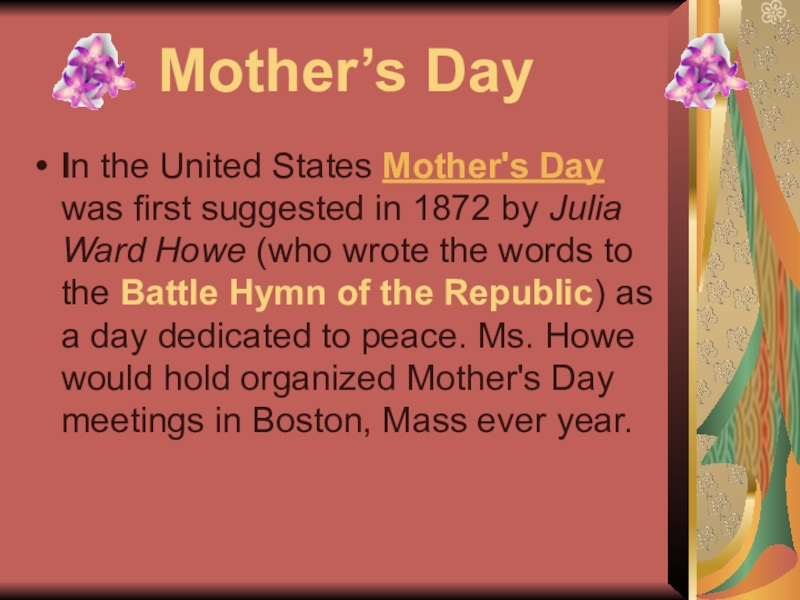 1872 by Julia Ward Howe (who wrote the words to the Battle hymn of the Republic) as a day dedicated to peace. Ms. Howe would hold organized Mother's Day meetings in Boston, Mass ever year.