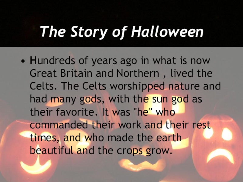 Great Britain and Northern , lived the Celts. The Celts worshipped nature and had many gods, with the sun god as their favorite. It was "he" who commanded their work and their rest times, and who made the earth beautiful and the crops grow.