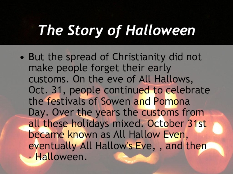 people forget their early customs. On the eve of All Hallows, Oct. 31, people continued to celebrate the festivals of Sowen and Pomona Day. Over the years the customs from all these holidays mixed. October 31st became known as All Hallow Even, eventually All Hallow's Eve, , and then - Halloween.