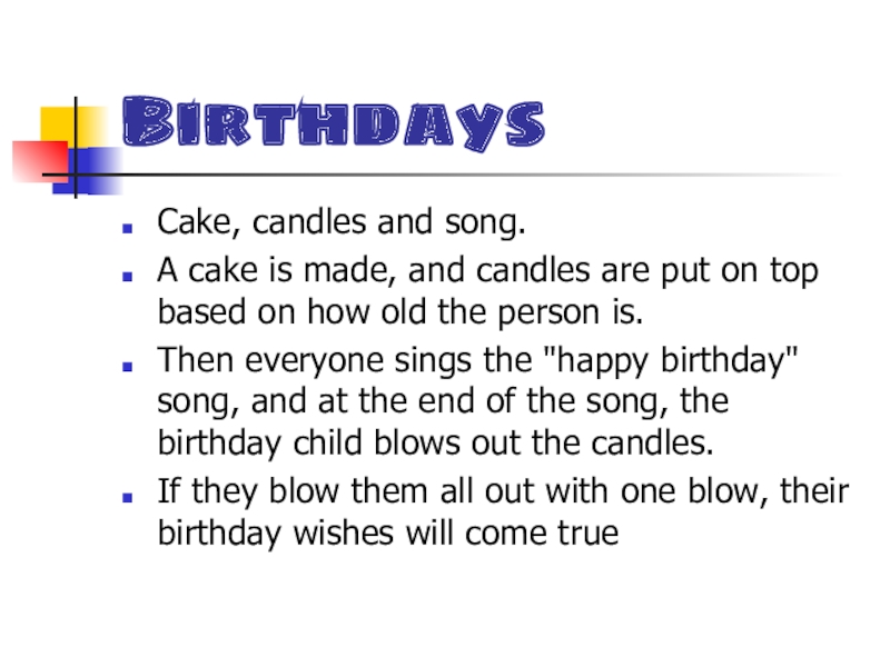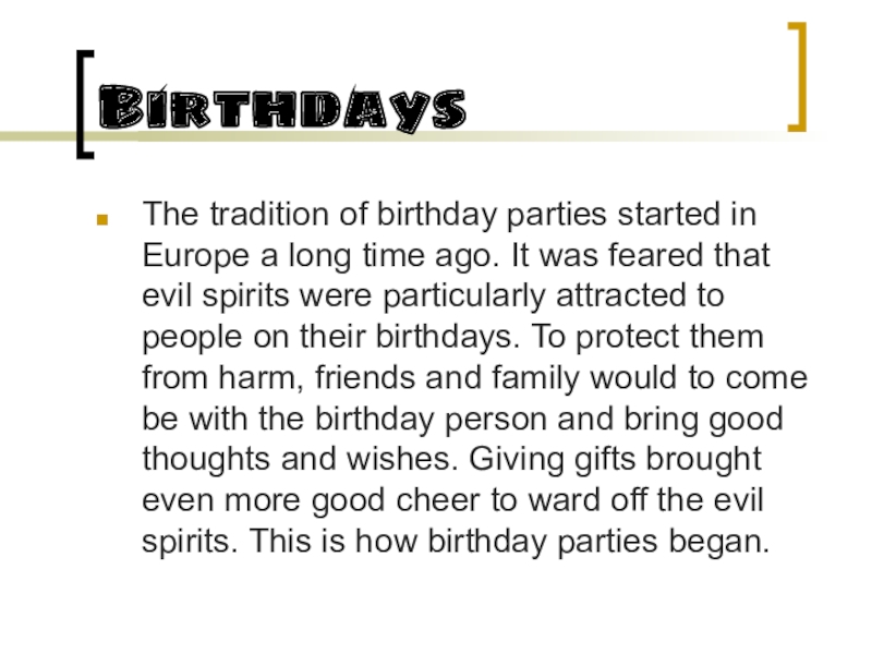 ago. It was feared that evil spirits were particularly attracted to people on their birthdays. To protect them from harm, friends and family would to come be with the birthday person and bring good thoughts and wishes. Giving gifts brought even more good cheer to ward off the evil spirits. This is how birthday parties began.