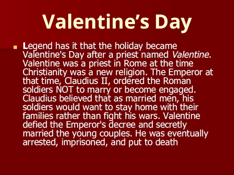 a priest named Valentine. Valentine was a priest in Rome at the time Christianity was a new religion. The Emperor at that time, Claudius II, ordered the Roman soldiers NOT to marry or become engaged. Claudius believed that as married men, his soldiers would want to stay home with their families rather than fight his wars. Valentine defied the Emperor's decree and secretly married the young couples. He was eventually arrested, imprisoned, and put to death