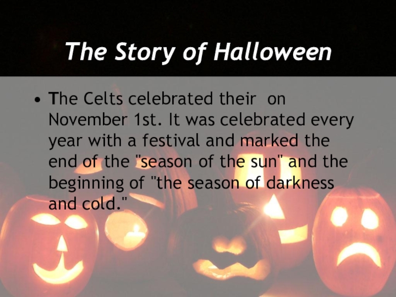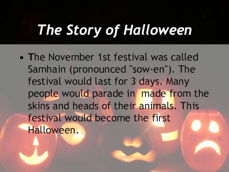 "sow-en"). The festival would last for 3 days. Many people would parade in made from the skins and heads of their animals. This festival would become the first Halloween.